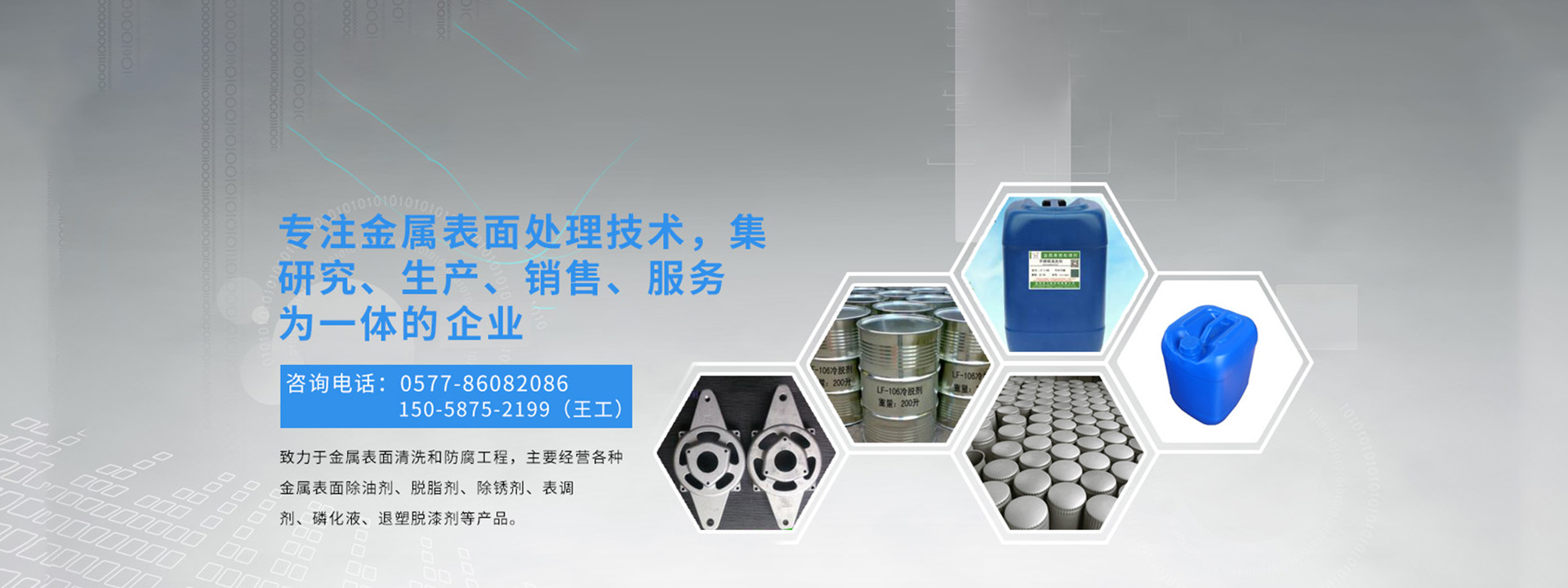 溫州龍飛環保科技有限公司是金屬表面處理技術集研究、生產、銷售、服務為一體的高新科技企業,致力于金屬表面清洗和防腐工程,主要經營各種金屬表面除油劑、脫脂劑、除銹劑、表調劑、磷化液、退塑脫漆劑、除蠟水、防銹水防銹油、封閉劑、鈍化劑、發黑劑、著色劑、化學拋光劑、合成乳化劑、水處理劑等金屬表面處理劑,廣泛適用于產品的噴塑、噴漆、噴砂、電泳、電鍍前的表面處理以及表面終處理,現已涉通用機械零部件、汽摩配件、五金及電工工具、電器電腦、潔具閥門、教學儀器等。